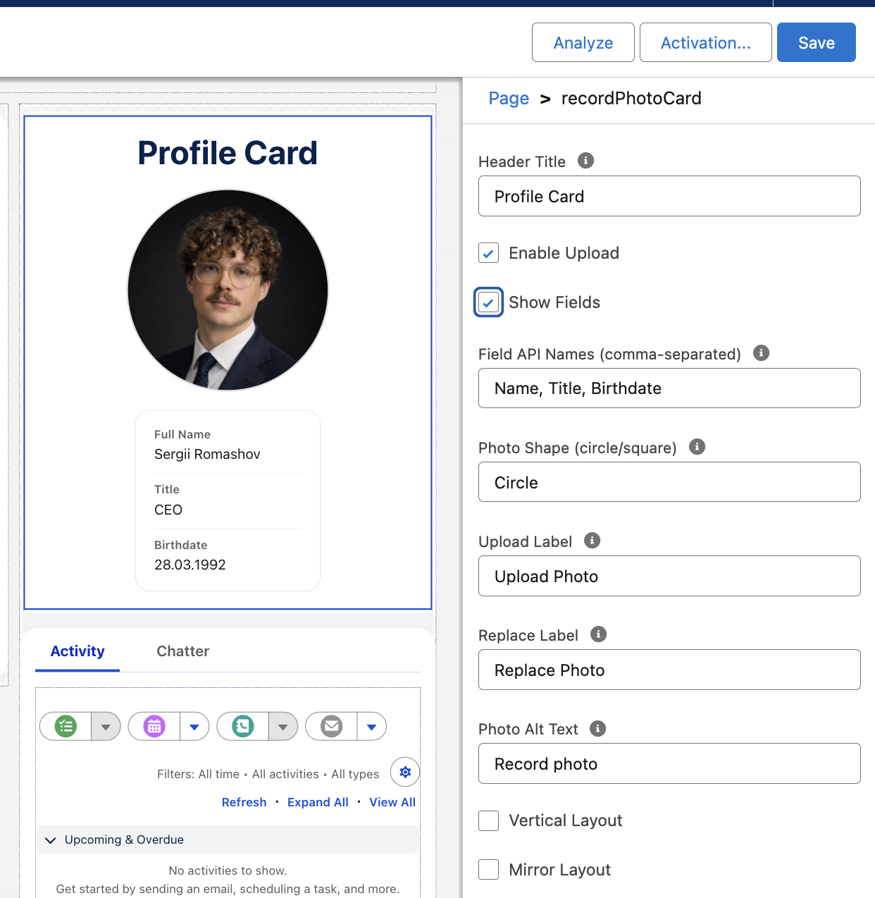 Record Photo & Logo Component for Salesforce is a Lightning Web Component that allows users to upload, crop, and display profile photos directly on Salesforce records.